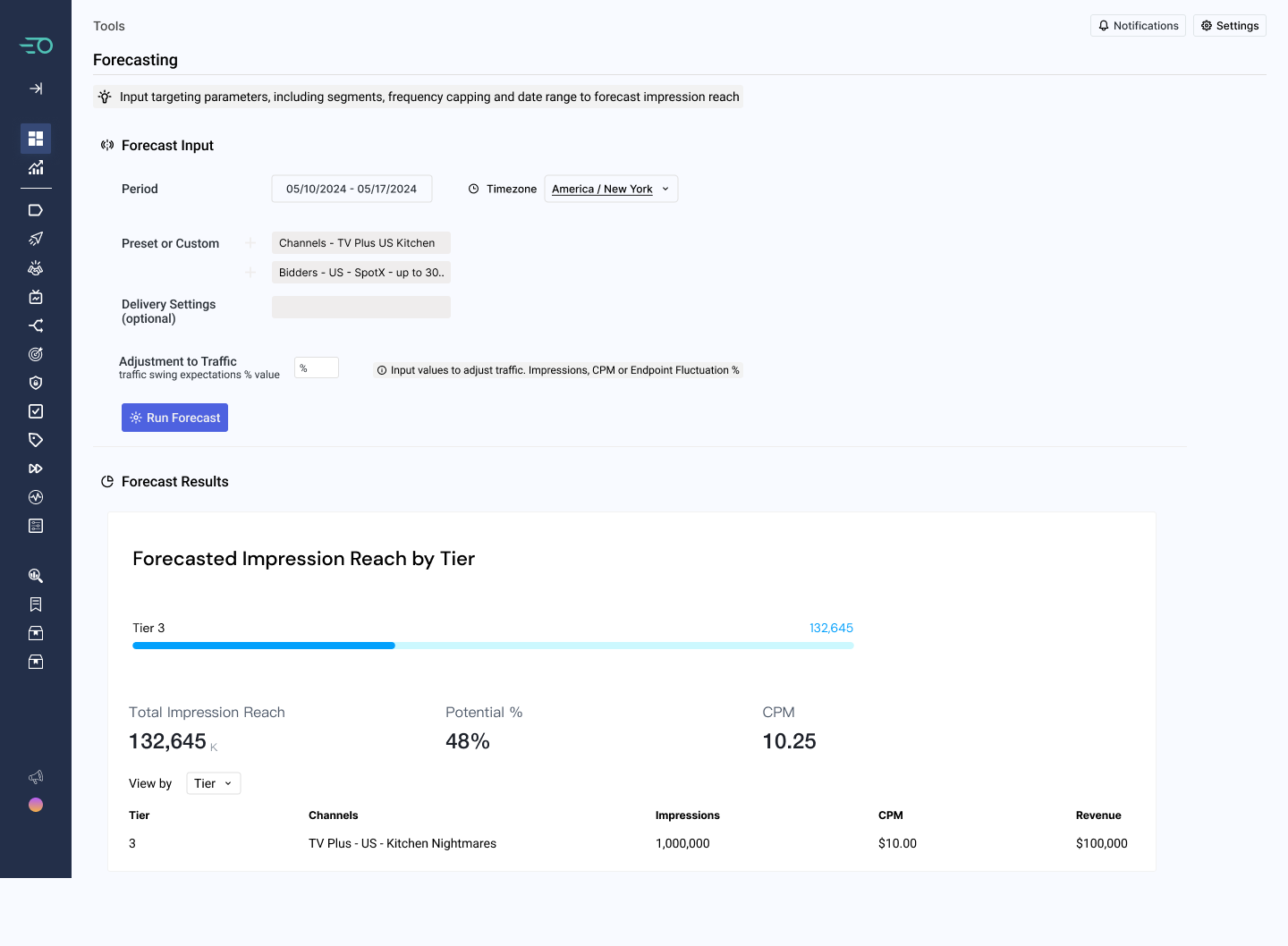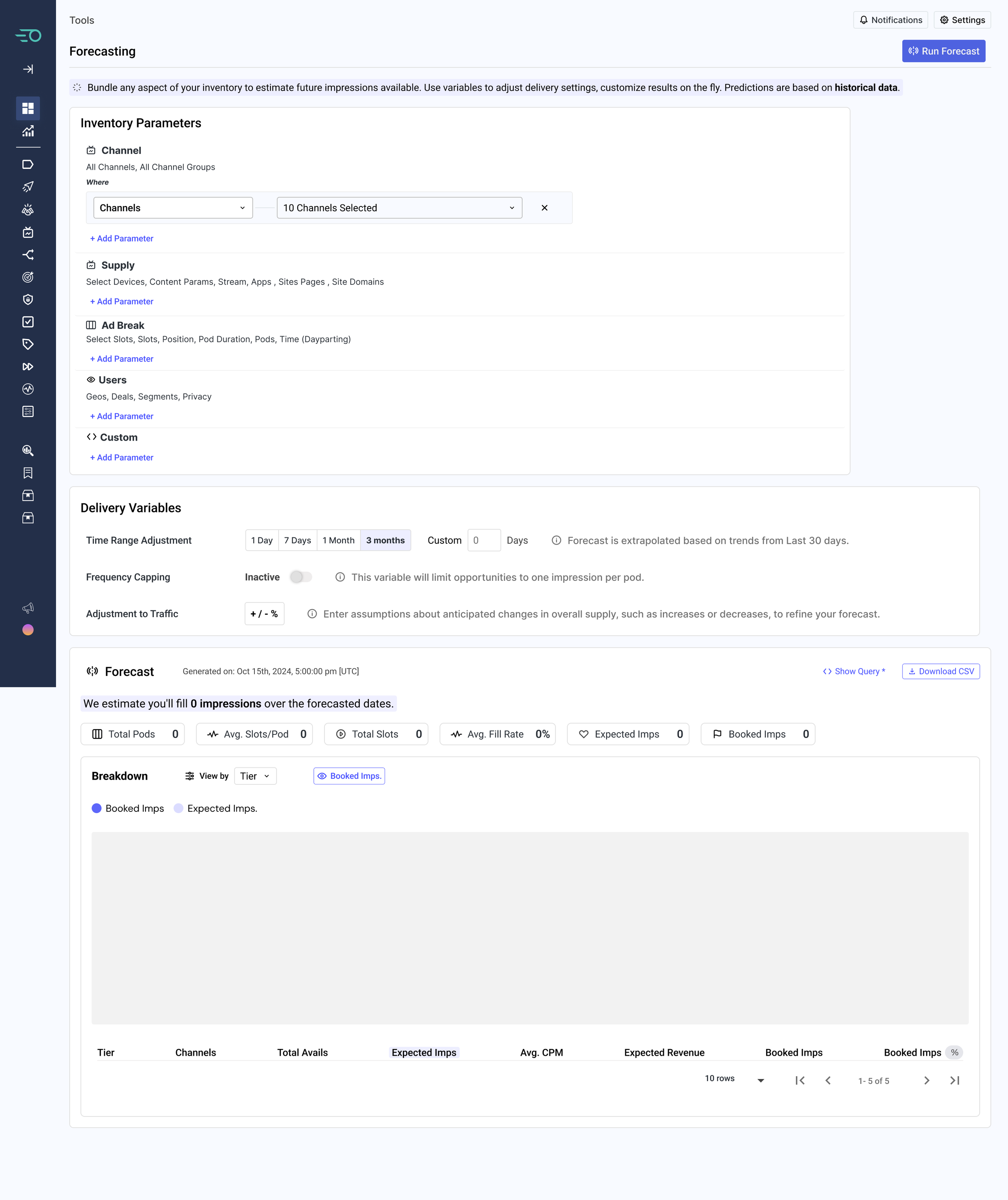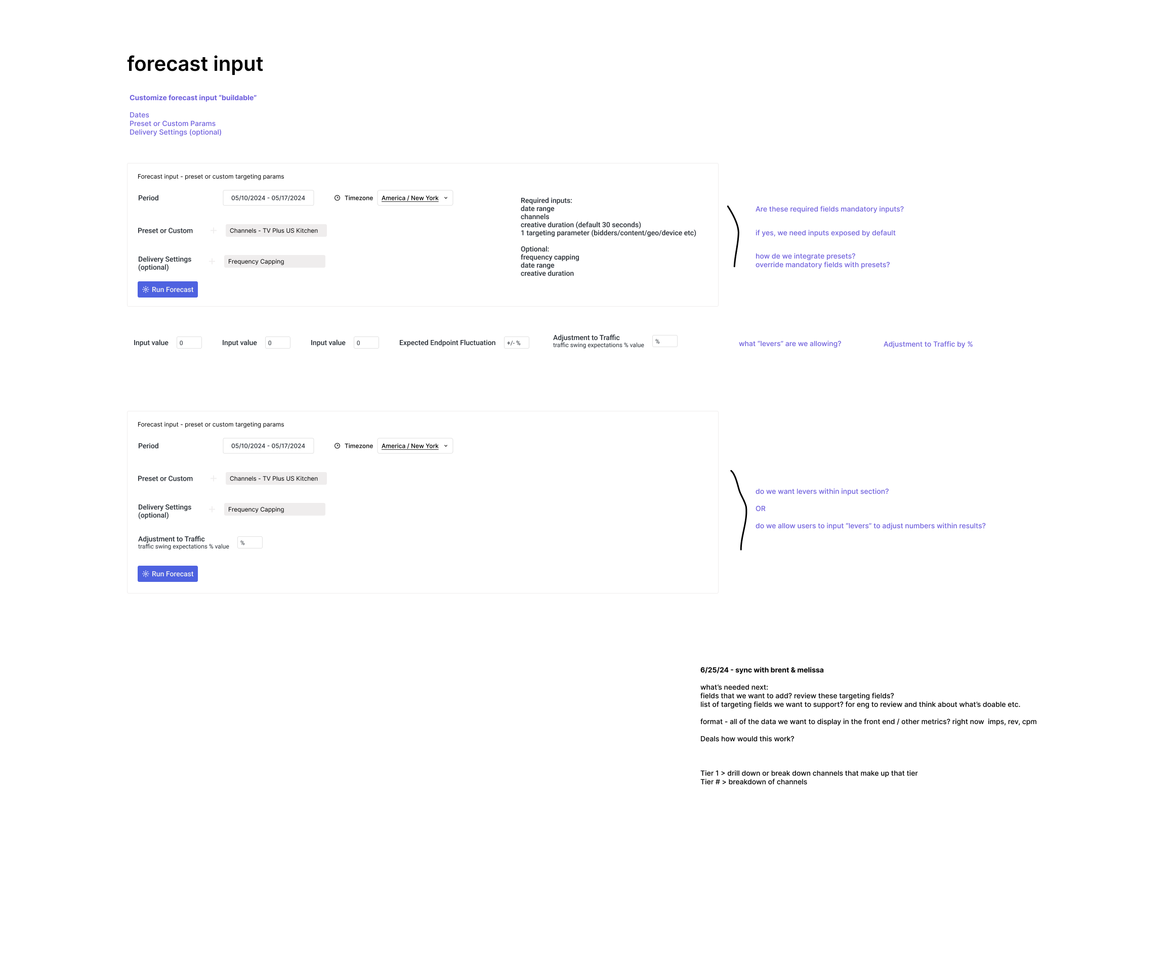 Forecast Inputs: Flexible, buildable fields for dates, delivery settings, and targeting